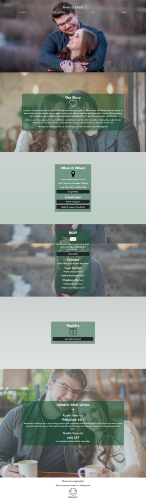 For website, I really wanted to replicate the single page app that I created for CaileyAndJustinWedding I made within Hugo, but within Gatsby. And it served its purpose of helping my brother collect RSVPs for his wedding.